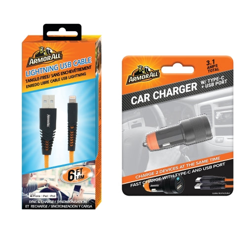 Car 6ft Lightning Charging Cable and 3.1 AMP Type-C and USB A Car Charger Port Bundle