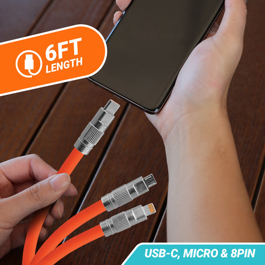 6FT Rugged 3-in-1 USBA Cable, Micro-USB, USB-C, & 8PIN, Mobile Device Charging
