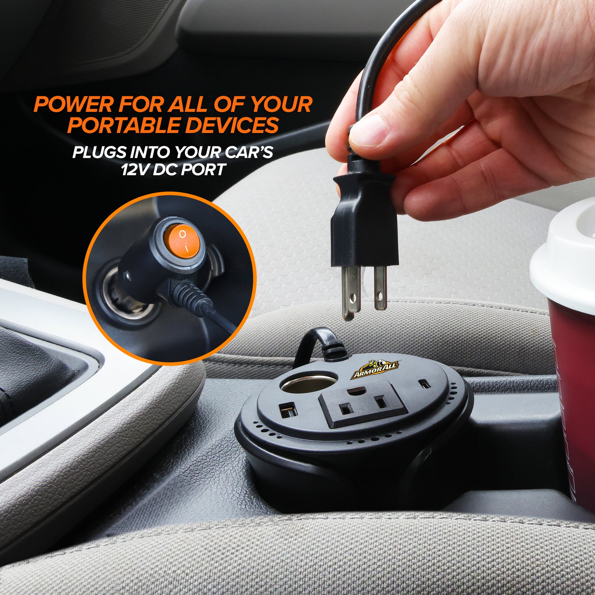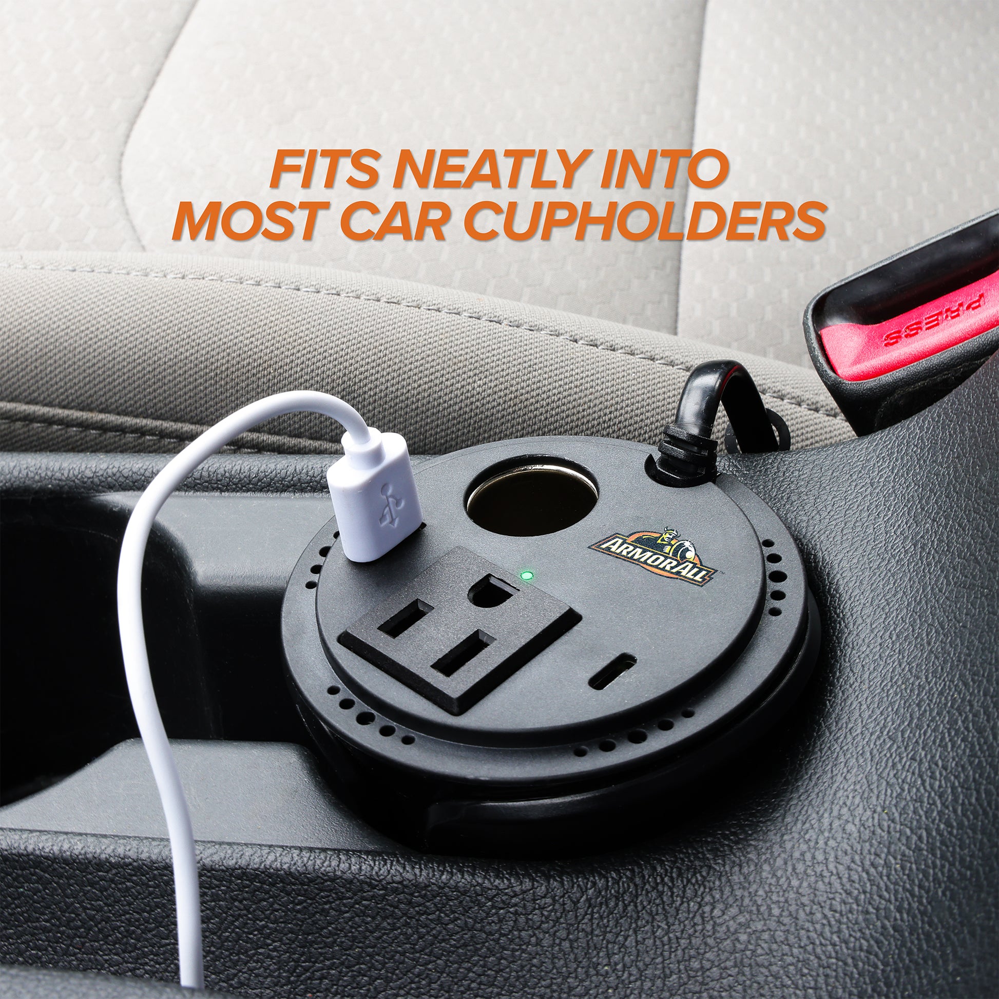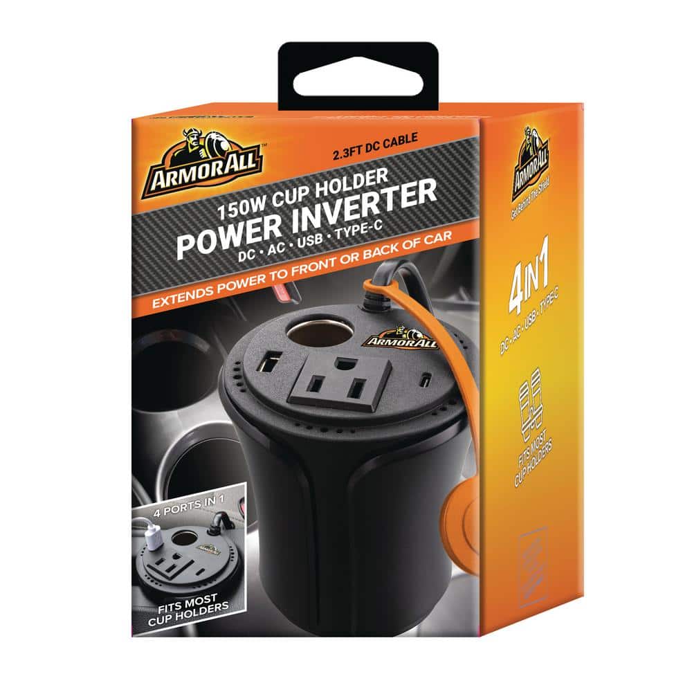 Transform your car’s cup holder into a versatile power station with the Armor All 150W Universal Cup Holder Power Inverter. This compact powerhouse easily converts your car’s 12V DC power into AC and DC outlets, USB-A ports, and a Type-C port, charging virtually any device on the go. Say goodbye to bulky adapters and tangled cords: Whether you need to charge your laptop, phone, camera, tablet, game console, or other essentials, the Armor All inverter keeps you powered up and connected wherever your travels take you. Charge multiple devices simultaneously: With two AC outlets, two DC outlets, two USB-A ports, and one Type-C port, you can power multiple devices at once, ensuring everyone in the car stays entertained and connected. Safe and reliable: Built with advanced safety features like overload protection, short circuit protection, and over-temperature protection, you can use the Armor All inverter with peace of mind, knowing your devices are always protected.