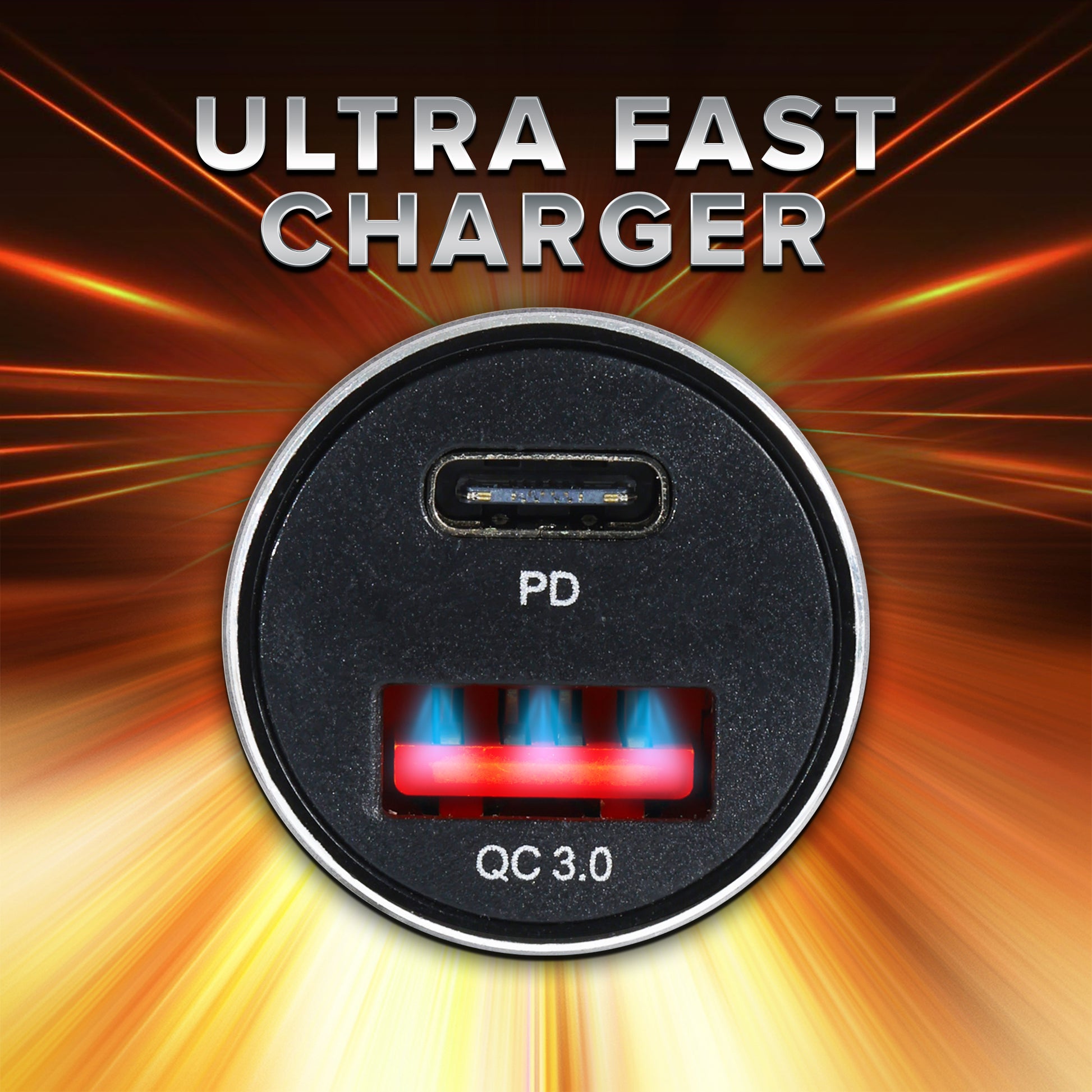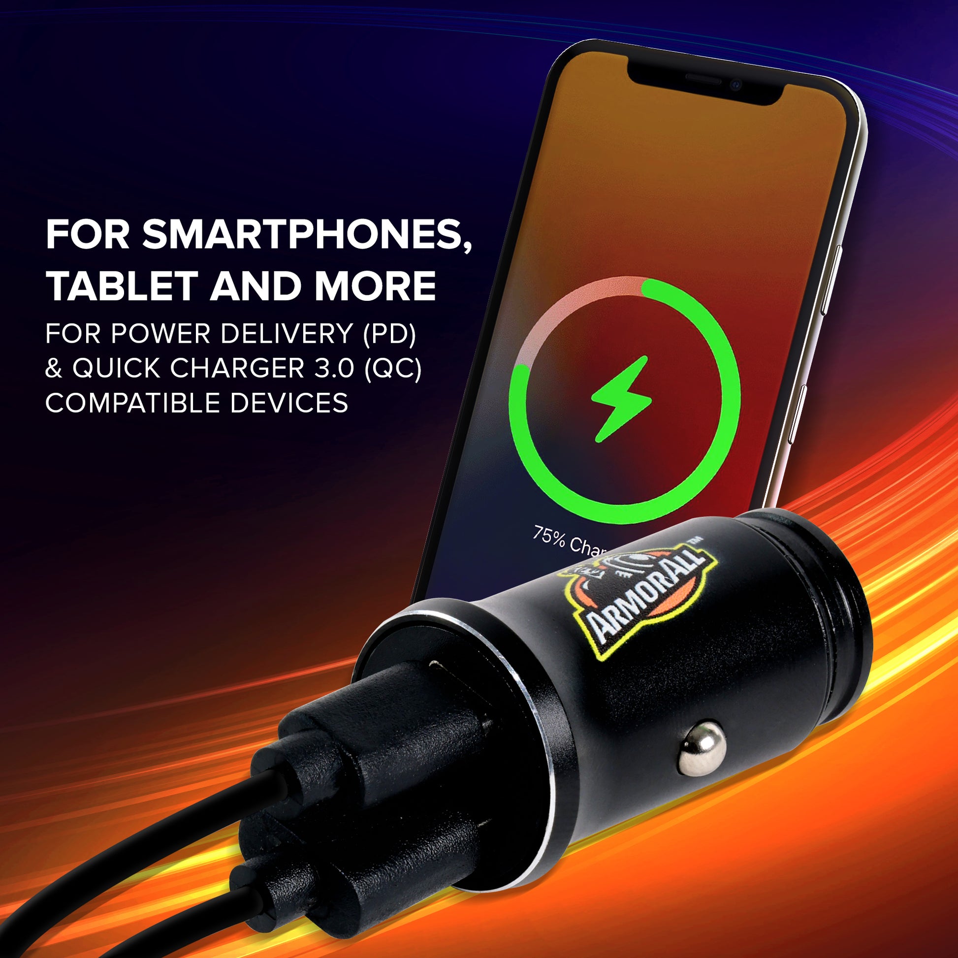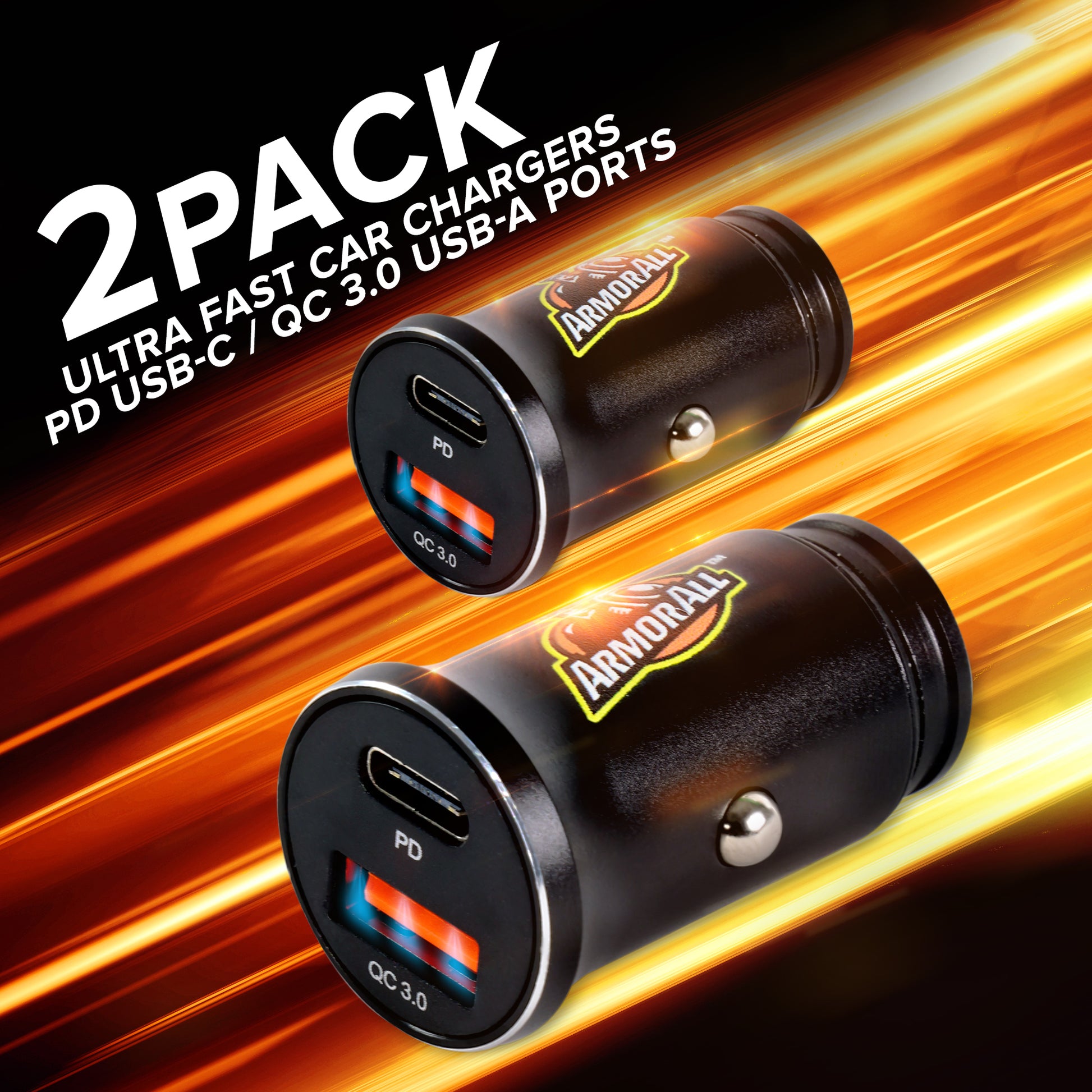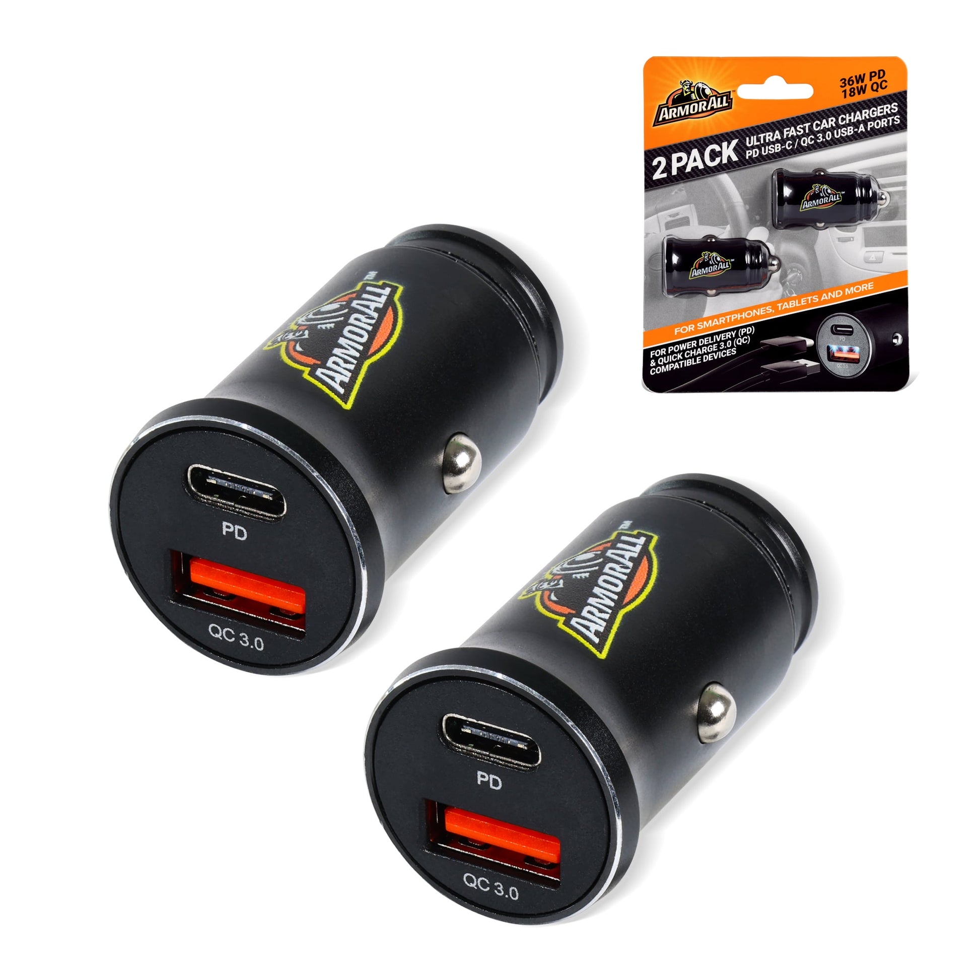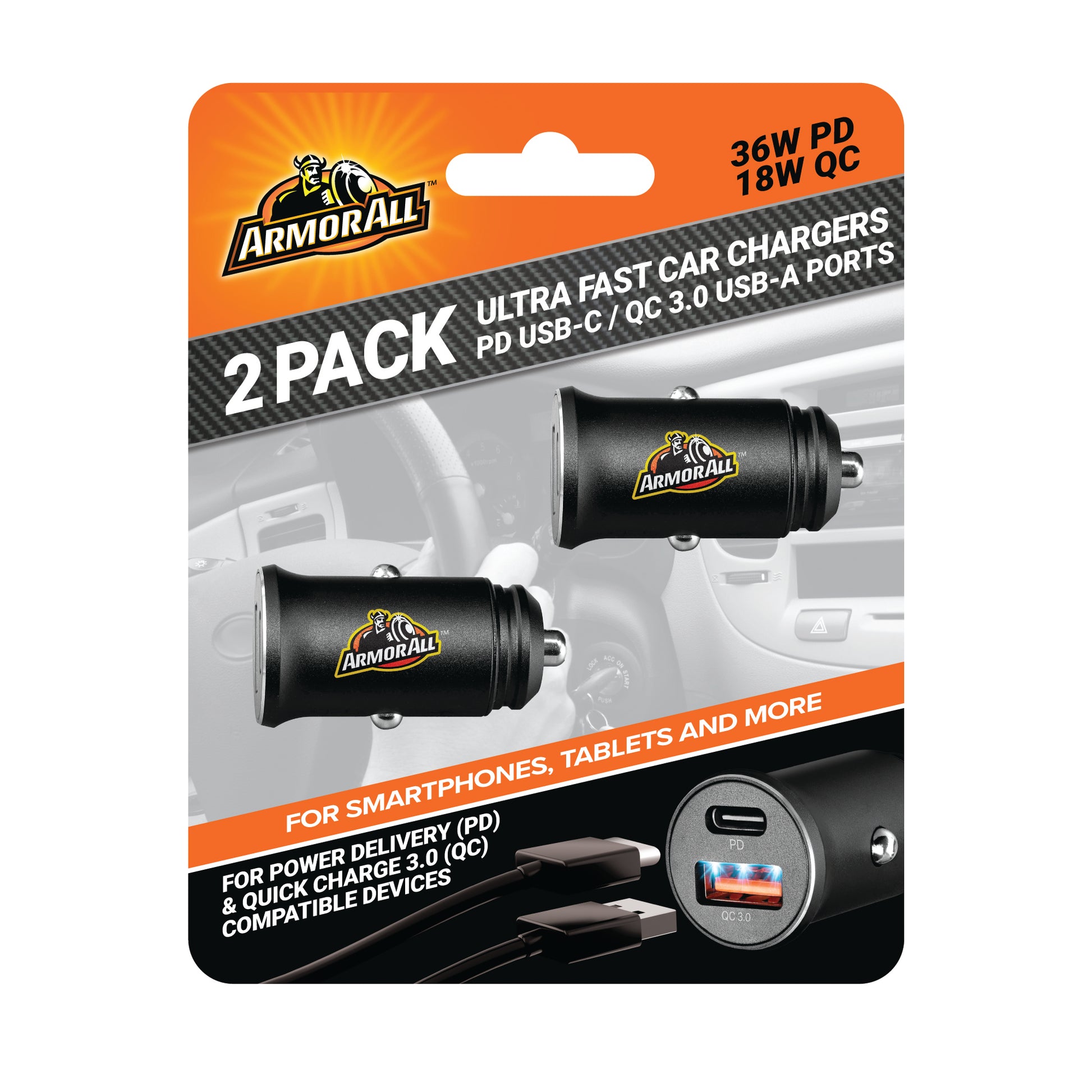 Experience rapid charging on the go with the Armor All 2 Pack Ultra-Fast Car Chargers. Designed with a 36W Power Delivery (PD) USB-C port and an 18W Quick Charge (QC) 3.0 USB-A port, this dual-port charger delivers the fastest charge for compatible smartphones and devices. Its compact design ensures it fits seamlessly into your car's charging port, and the LED illumination makes it easy to find in the dark. Perfect for keeping your smartphones, tablets, and other devices charged while on the move. Usage Instructions: Plug the charger into your vehicle's 12V outlet and connect your device using a compatible USB-C or USB-A cable for fast and reliable charging. Ideal For: Smartphones Tablets Other USB-powered devices Additional Information: These chargers are designed to provide a safe and efficient charge, keeping your devices powered up for your journeys.