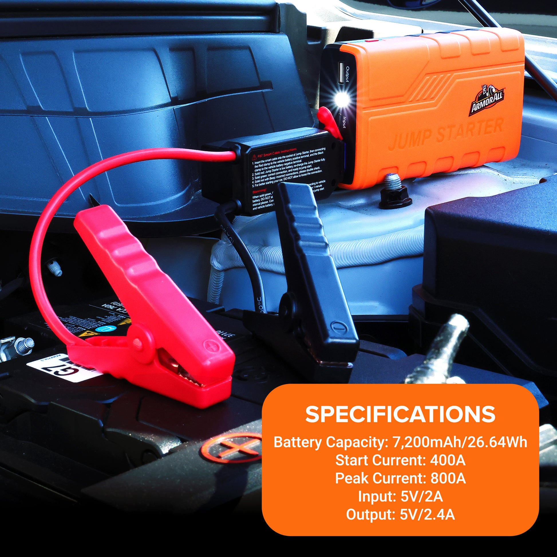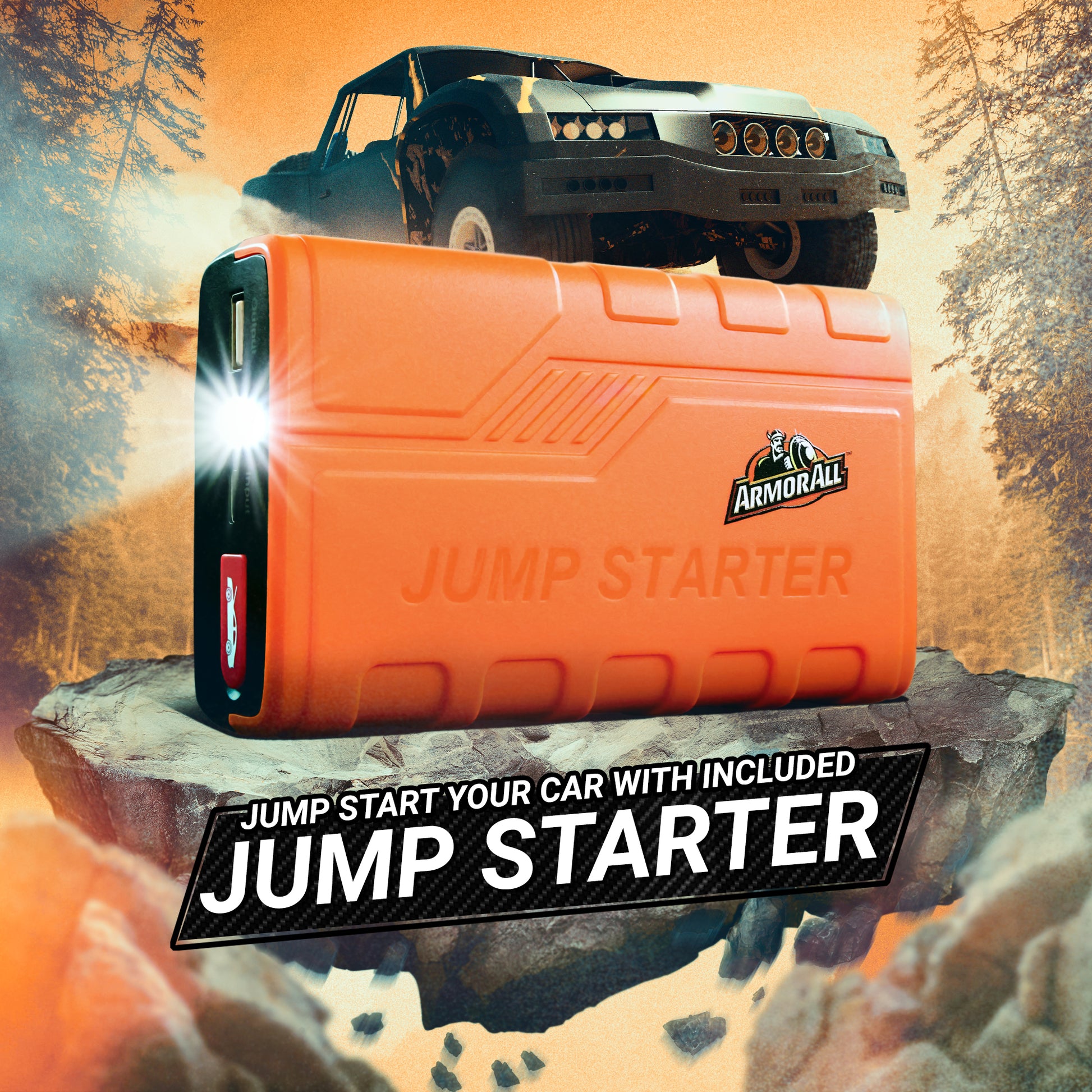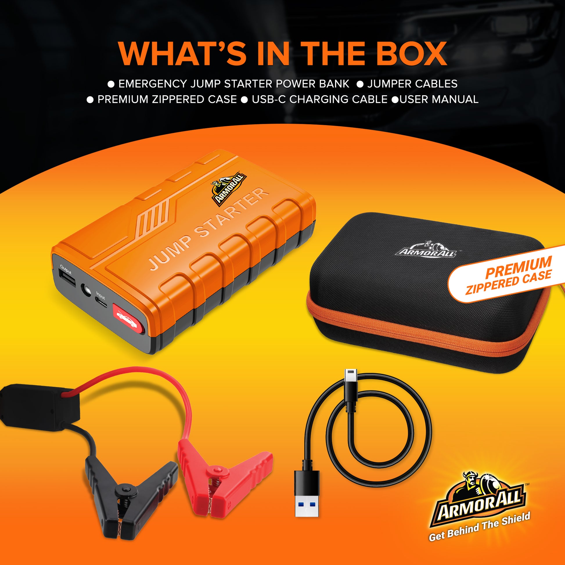 Get Behind The Shield With The Armor All™ Rechargeable Jump Starter and Power Bank. This Armor All Emergency Jump Starter Kit has enough power (600 Peak Amps) to jump start most vehicles on the road. This device comes with its own jumper cables and works with cars, motorcycles, watercrafts, ATVs, UTVs, SUVs, lawn mowers, pickups, snowmobiles and more. The convenient carrying case can be easily stored in your trunk or under your seat for easy access. Designed with a 2.1Amp USB-A port, this device is also a portable power bank which can charge your devices quickly and is compatible with almost all USB charging devices – including cell phones, tablets, Kindles, digital cameras, and more. The intelligent jumper clamp features multiple advanced safety technologies including over-current protection, overload protection, over-voltage protection, over-charge protection and high-temperature protection, ensuring it is safe for anyone to use. This device comes shielded with a rubber case and removable dust cover for added protection against wear and tear. The built-in ultra-bright LED light comes with 3 modes: Flashlight, Strobe Light and SOS Light. This multi-purpose flashlight is great for camping, outdoors, indoors, emergencies, travel, and more.