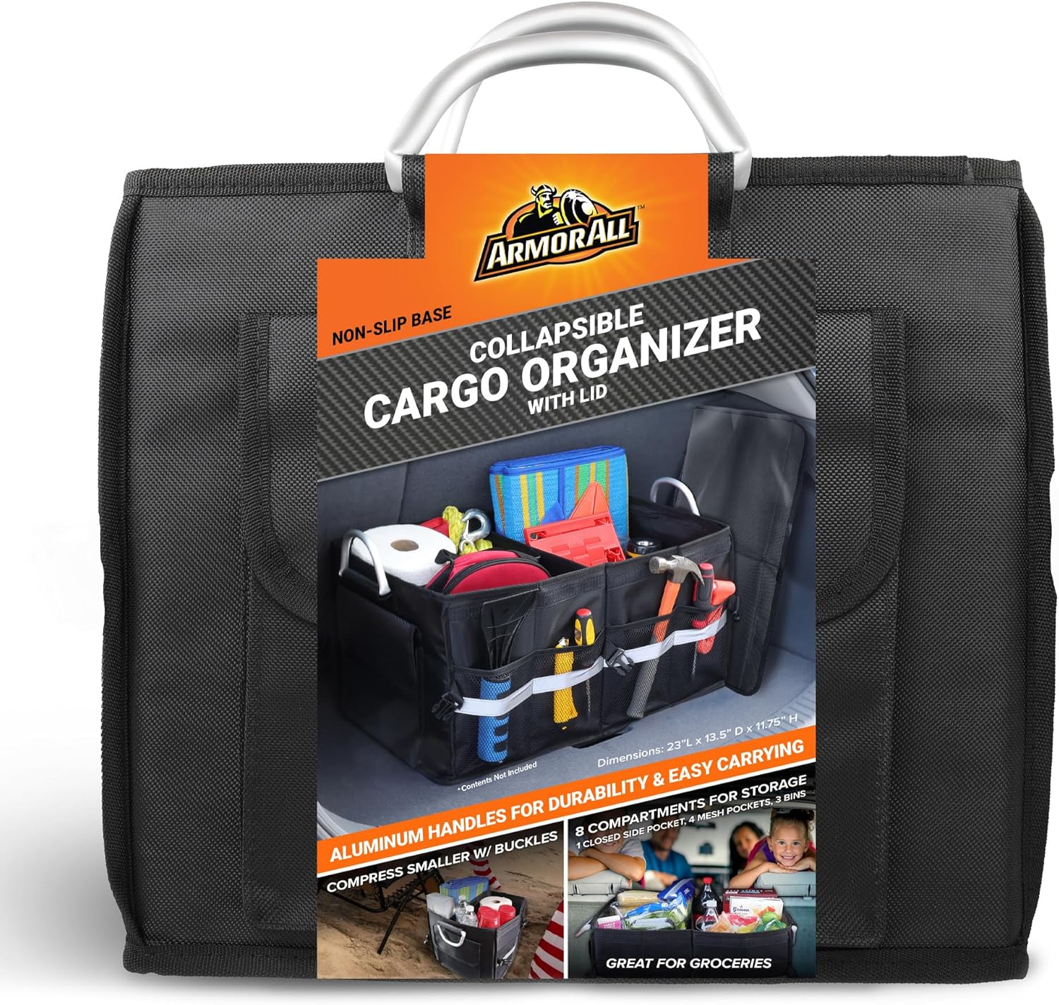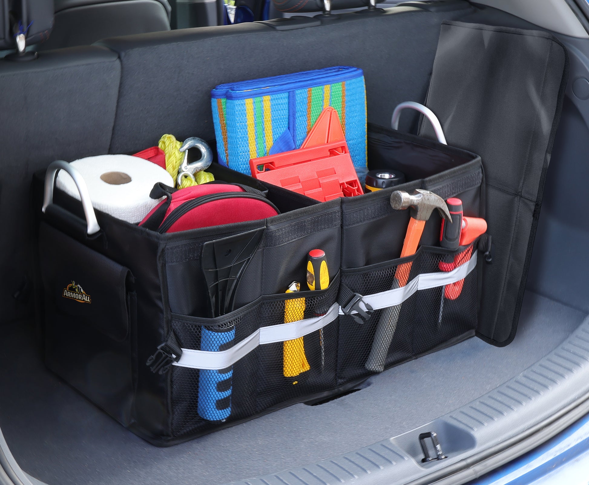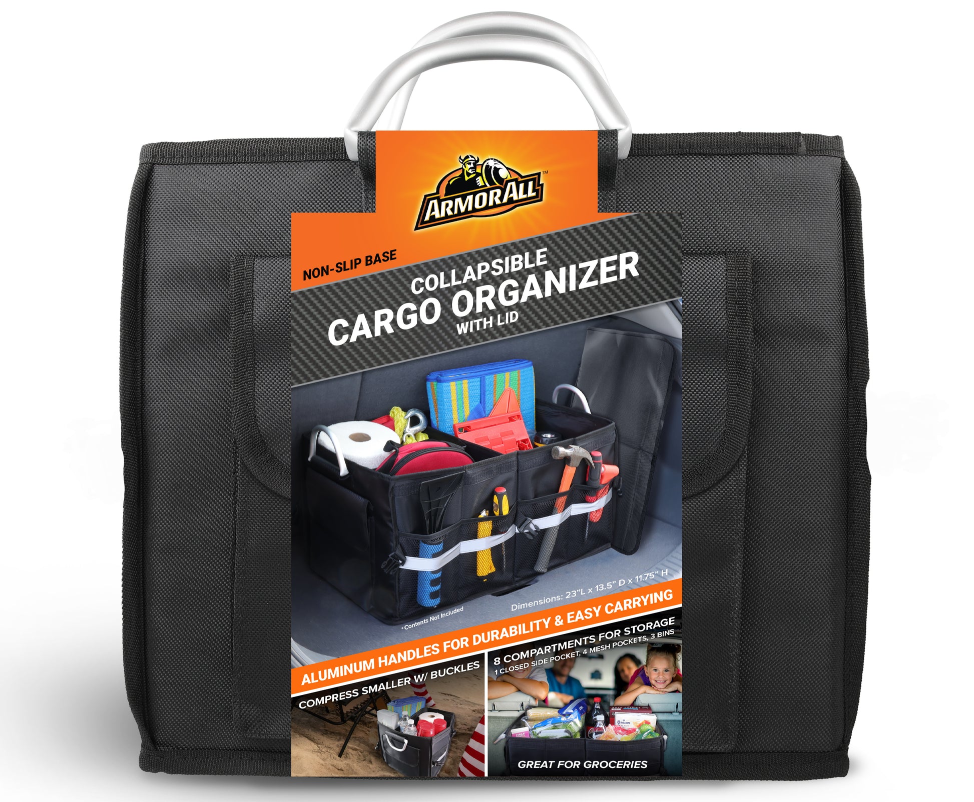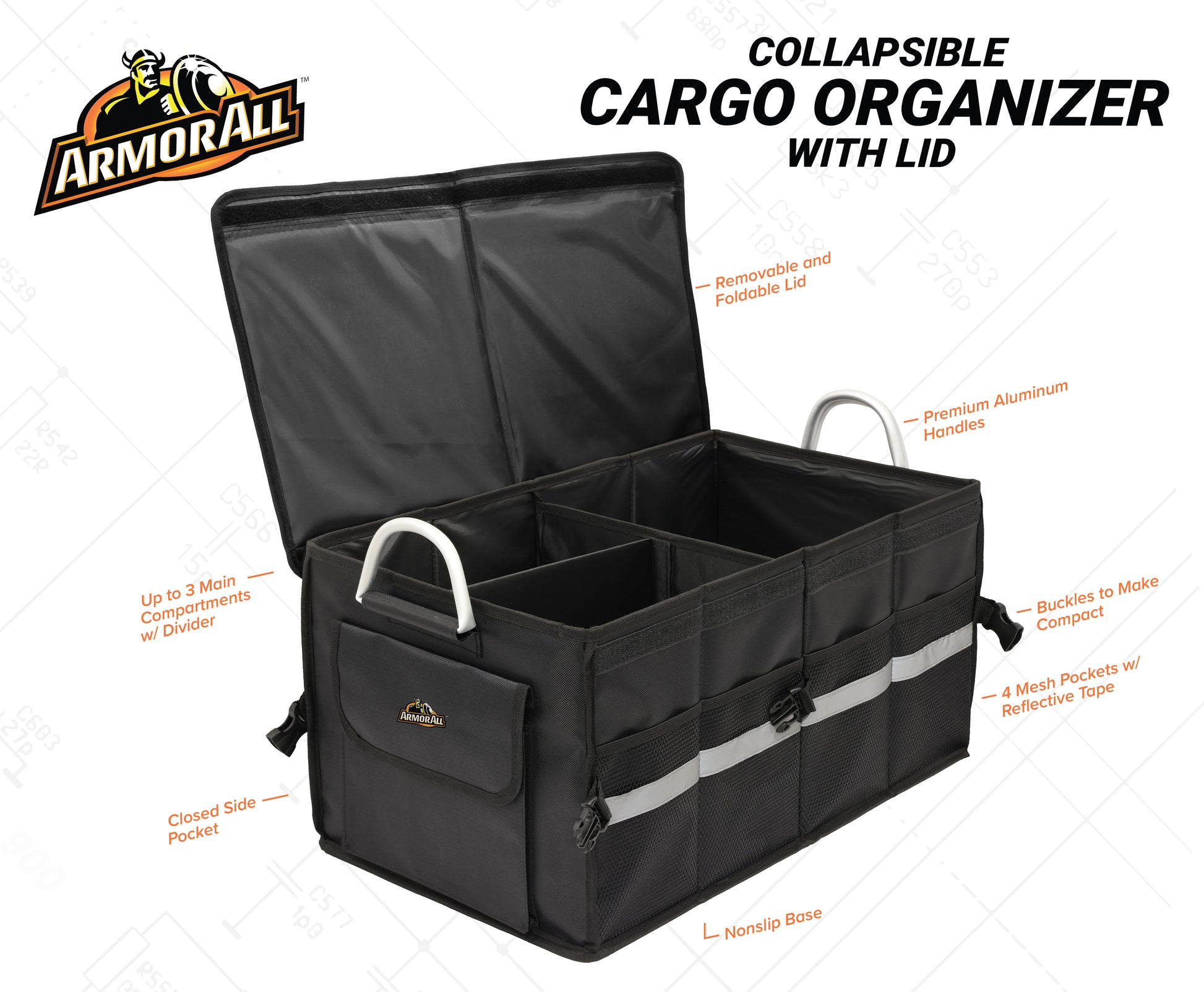 The Armor All Heavy Duty Collapsible Car Trunk Organizer is the perfect solution for maintaining a neat and organized trunk. Built with high-quality, durable materials, this organizer is designed to withstand heavy use and the demands of various cargo, providing a robust and reliable storage solution. Its collapsible design allows for easy folding when not in use, saving valuable trunk space and enabling convenient storage. Whether you're carrying groceries, sports equipment, or emergency supplies, the three spacious compartments provide ample room to keep everything organized and easily accessible. Equipped with a non-slip base, the organizer remains securely in place, even during sharp turns and sudden stops, ensuring stability and protecting your items. The sturdy aluminum handles offer a comfortable grip for easy carrying, and the removable lid adds an extra layer of security, keeping your belongings safe from dust and debris. For additional convenience, the organizer includes a side pocket for storing smaller items and buckles to keep everything securely in place. Ideal for cars, trucks, and SUVs, the Armor All Heavy Duty Collapsible Car Trunk Organizer is a versatile and practical addition to any vehicle, helping you maintain a tidy and efficient trunk space.