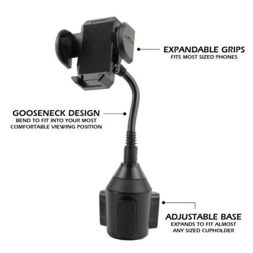 Car Cupholder Phone Mount Adjustable Gooseneck and Car Charger with 2 USB Ports Bundle