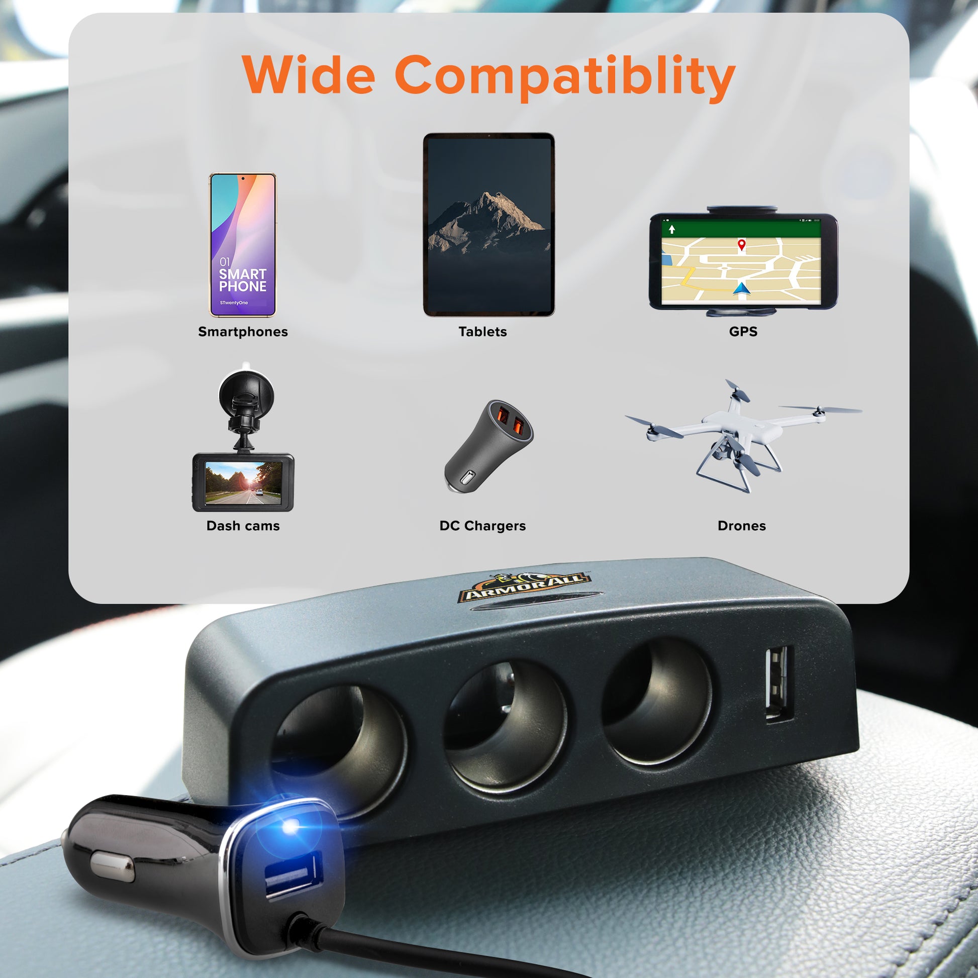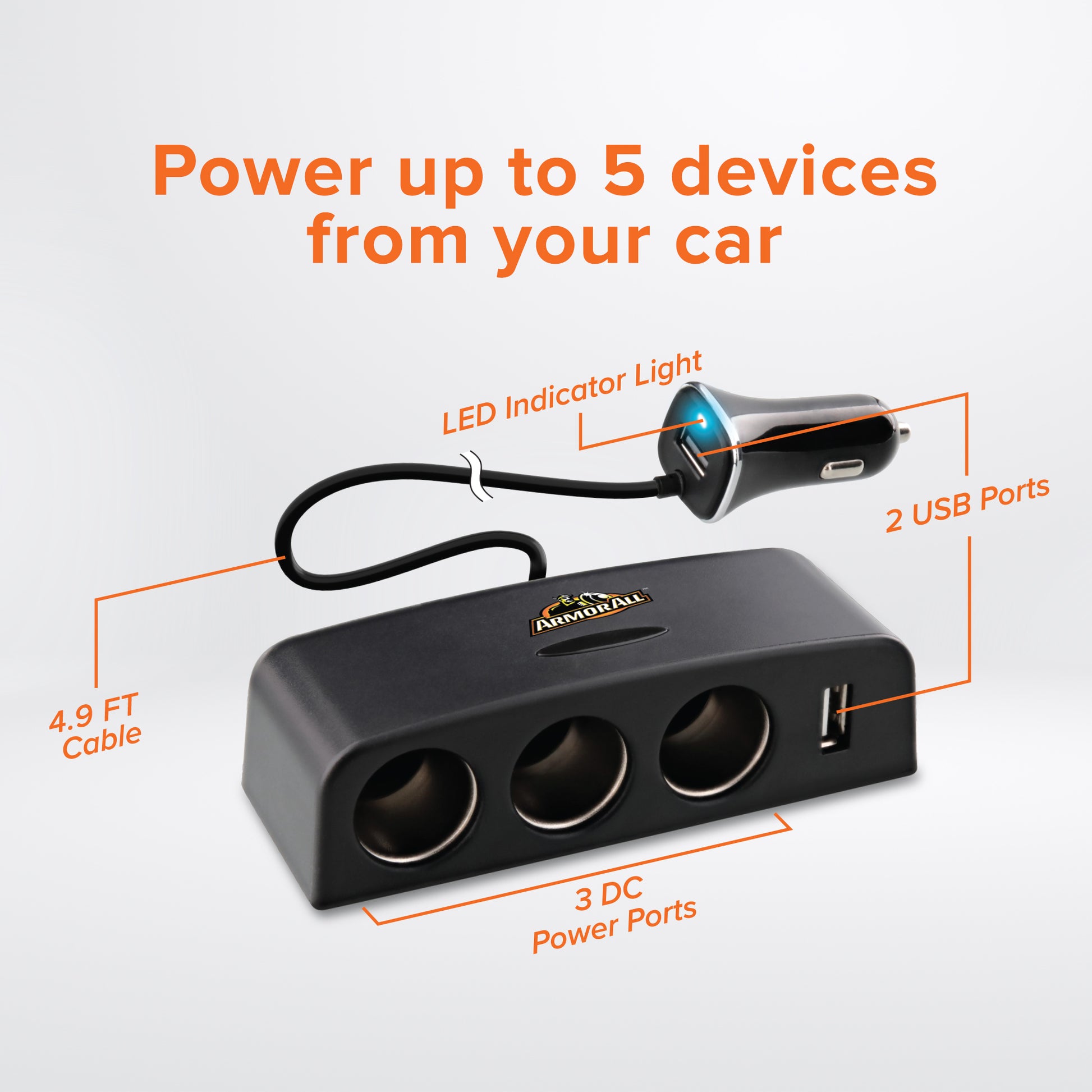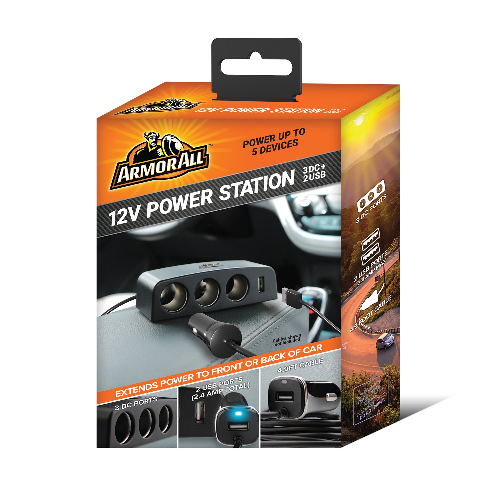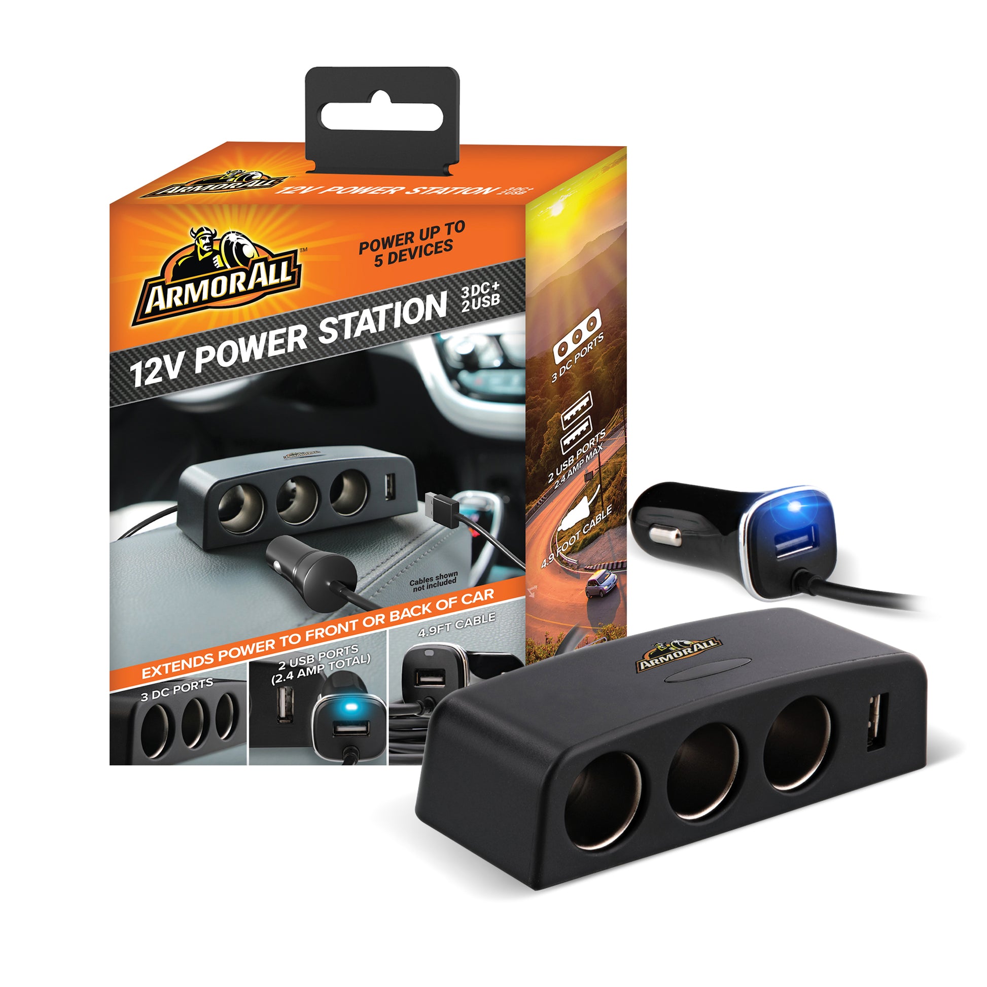When bringing your devices on the go, you want a convenient place to power them without issue. With the Armor All 12V Power Station, you'll have 5 ways to charge your most important devices. Beyond smartphones, you can power laptops, tablets, GPS devices, seat warmers, any items you want. The 3 DC Power Ports have a combined 12V amperage, while the 2 USB-A ports have a total combined output of 2.4 Amps. Plug your station into your car's DC Port to receive instant connectivity as long as your engine is running. Our device also features an LED light indicator that showcases power is flowing direct to any connected items. Get your devices charged and fully working with the 12V Power Station with Armor All.