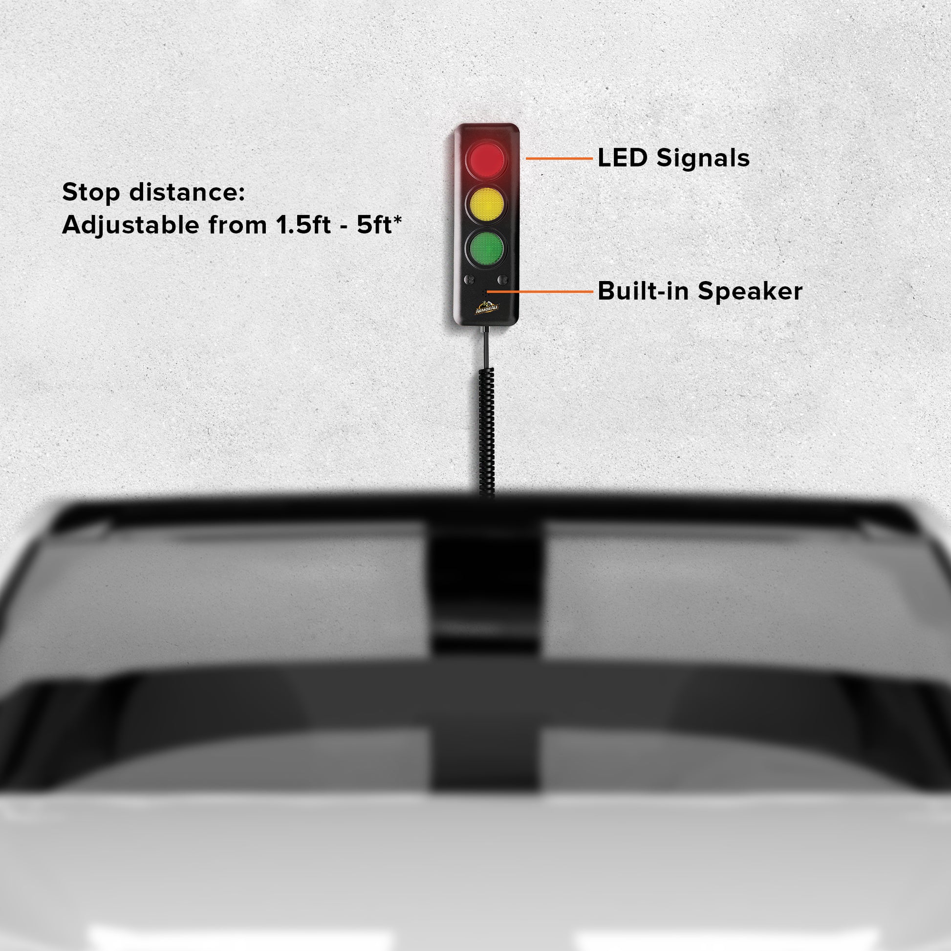 - It features green, yellow, and red lights that indicate how close you are to the wall or other objects. Along with audio alerts that beep faster as you approach the stop distance.