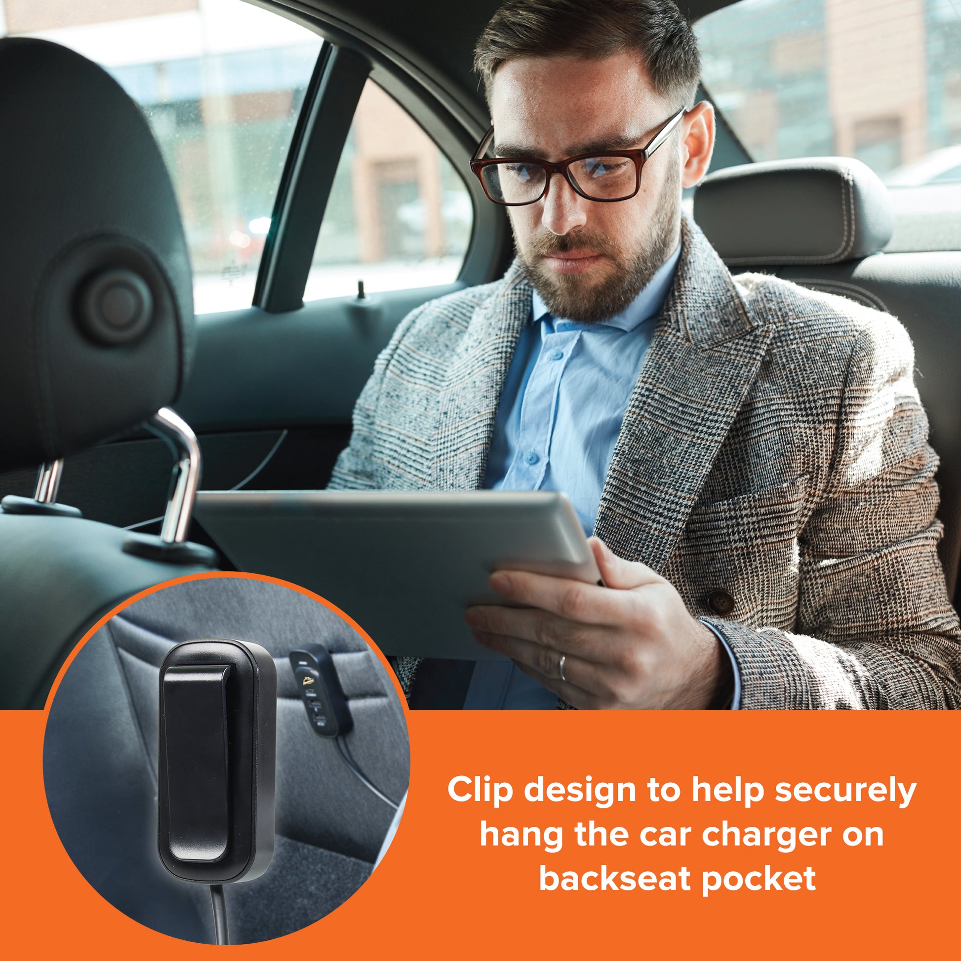 Backseat Passenger Extension: A long 5ft cable with a built-in clip allows you to extend charging access to the back of the car for convenient, hassle-free use.