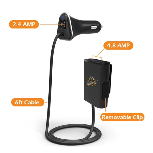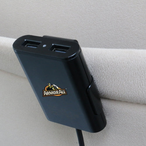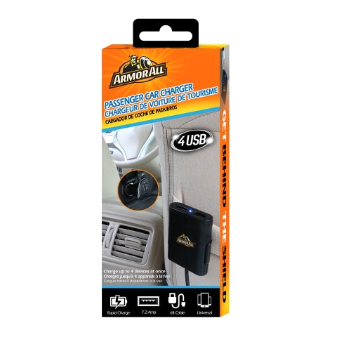 Get Behind The Shield With The Armor ALL™ 4-Port Passenger Car Charger. This charger allows you to charge up to 4 devices at the same time. Easily charge your mobile device and GPS system as well as providing charging ports for passengers on road trips. Its also a great item for Ride Sharing drivers as it conveniently clips onto back of seat organizers or pouches.