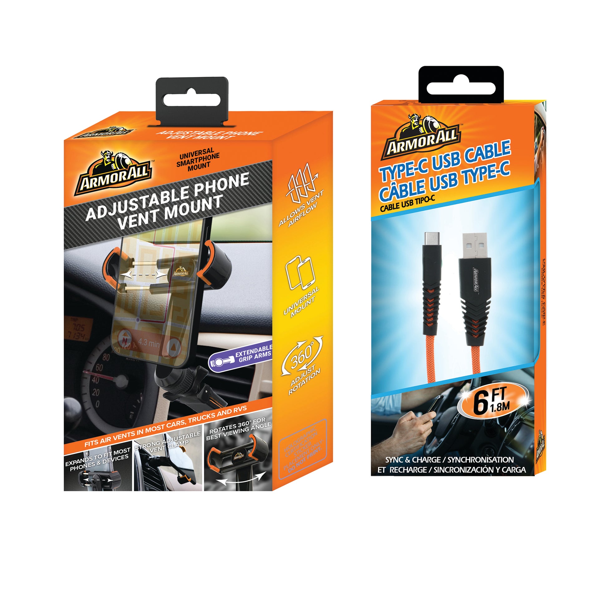 Drive safely and hands-free with the Armor All Car Phone Mount Bundle. This convenient bundle includes everything you need to keep your phone secure and charged while you’re on the go. The Armor All vent phone mount is a versatile and adjustable mount that fits most cars and smartphones. The gooseneck design allows you to position your phone perfectly, and the suction cup base provides a secure hold. The Armor All 6ft usb type-c cable is a durable and long-lasting cable that can be used to charge your phone or transfer data. The cable is made from high-quality materials and is resistant to kinking and fraying. With the Armor All Car Phone Mount Bundle, you can stay connected and safe while you’re driving. Order your bundle today!